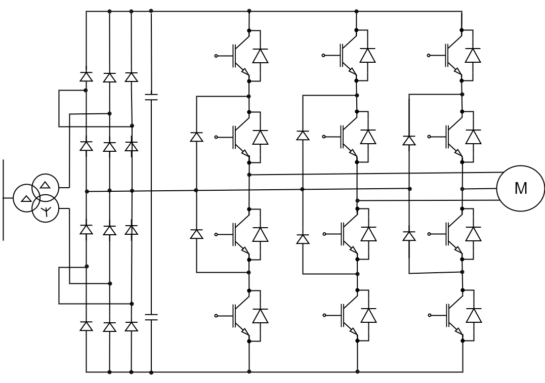 拓撲1:整流+三相三電平方案該拓撲主要用于中壓變頻器。